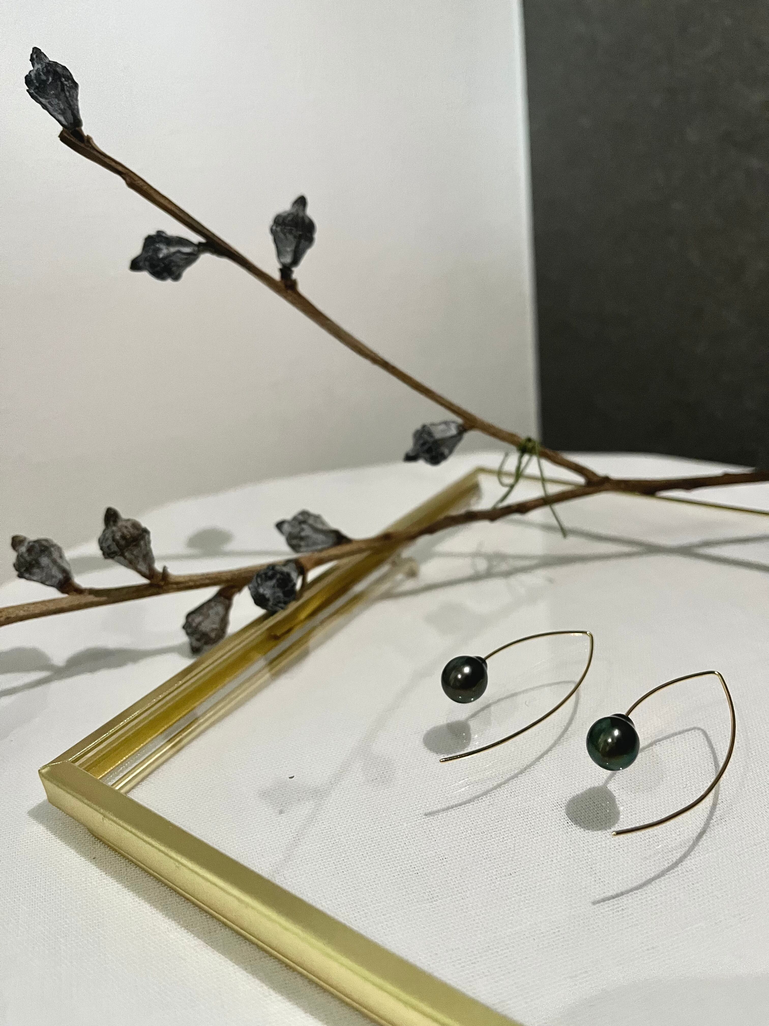k18イエローゴールドと黒蝶真珠を組み合わせた上品かつエレガントなピアス。