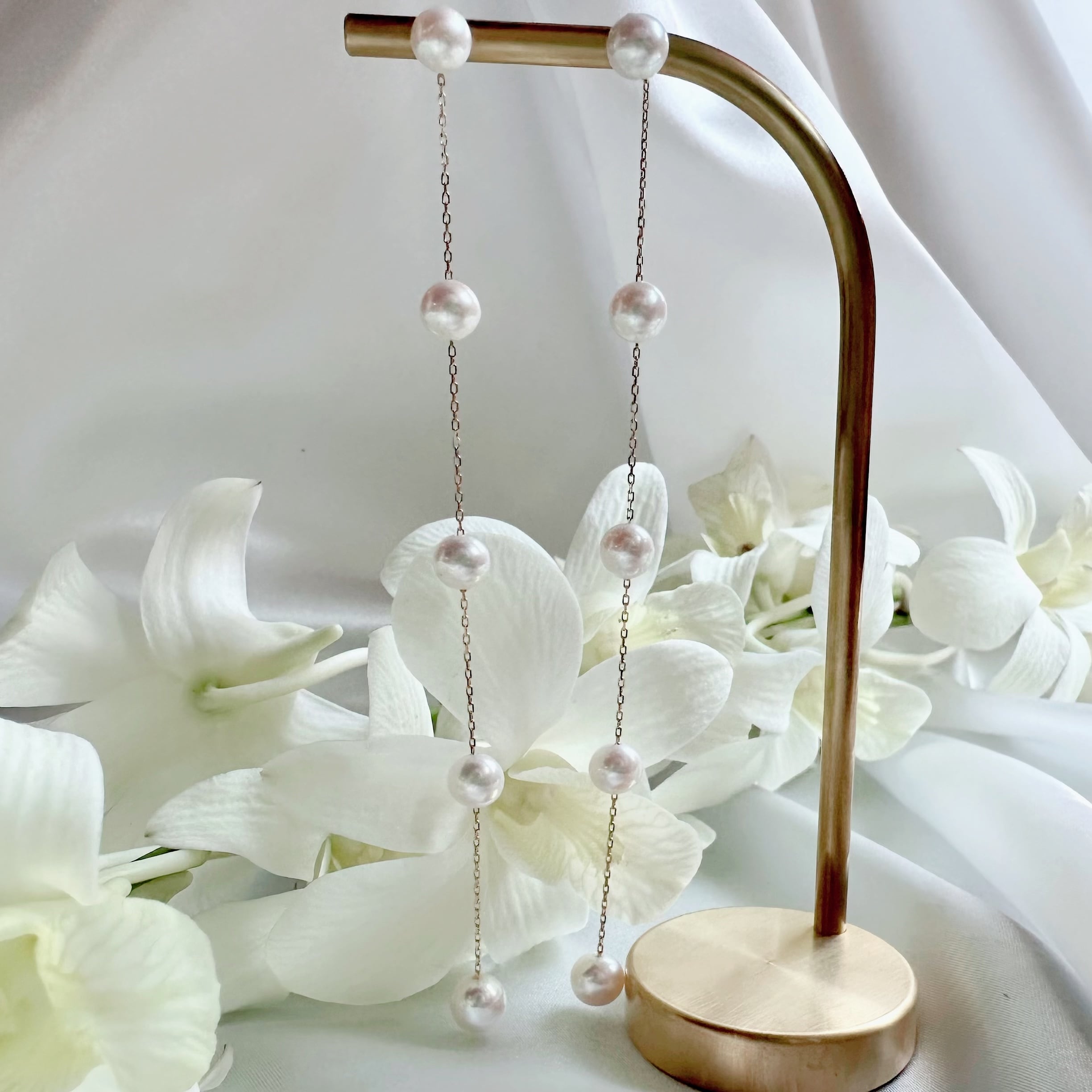 パールの光沢や清らかなホワイトカラーが、表情を明るく上向きにしてくれるリズミカルなデザインのパールピアス。