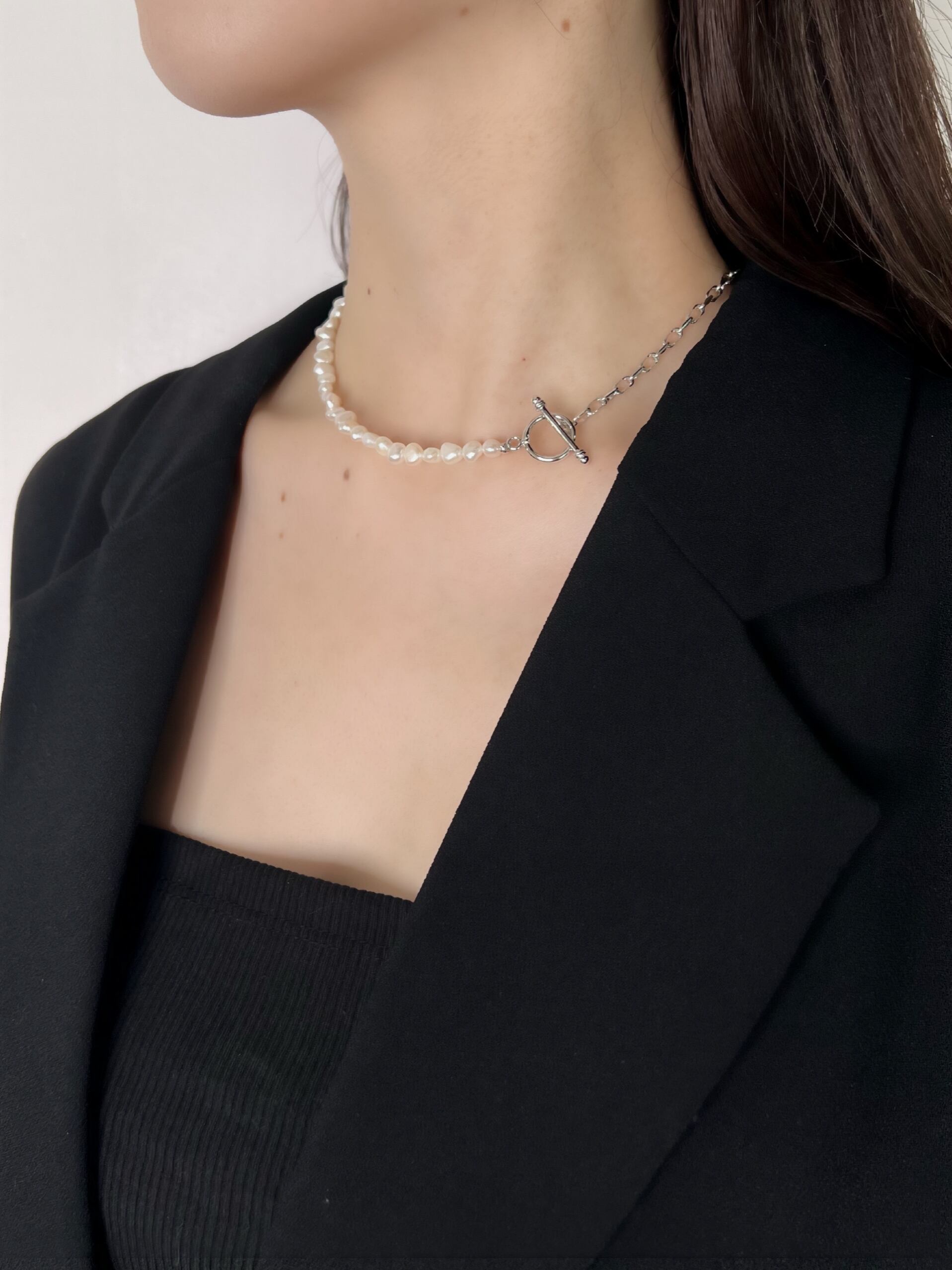 メタリックな煌めきと輝くパールが、華やかなネックラインを演出するネックレス。